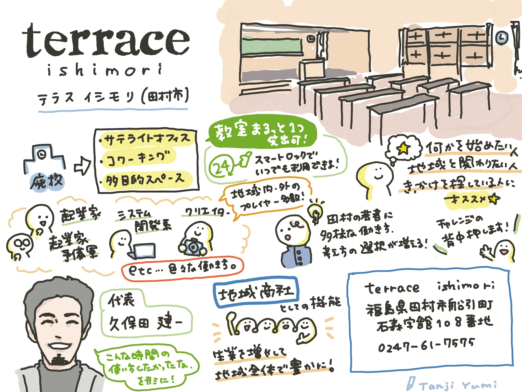 「テラス石森」は福島県田村市における新たなビジネス・雇用・職業の創出、働き方改革、学び・交流・情報発信の拠点として、廃校となった旧石森小学校を活用してつくられたテレワークセンター。